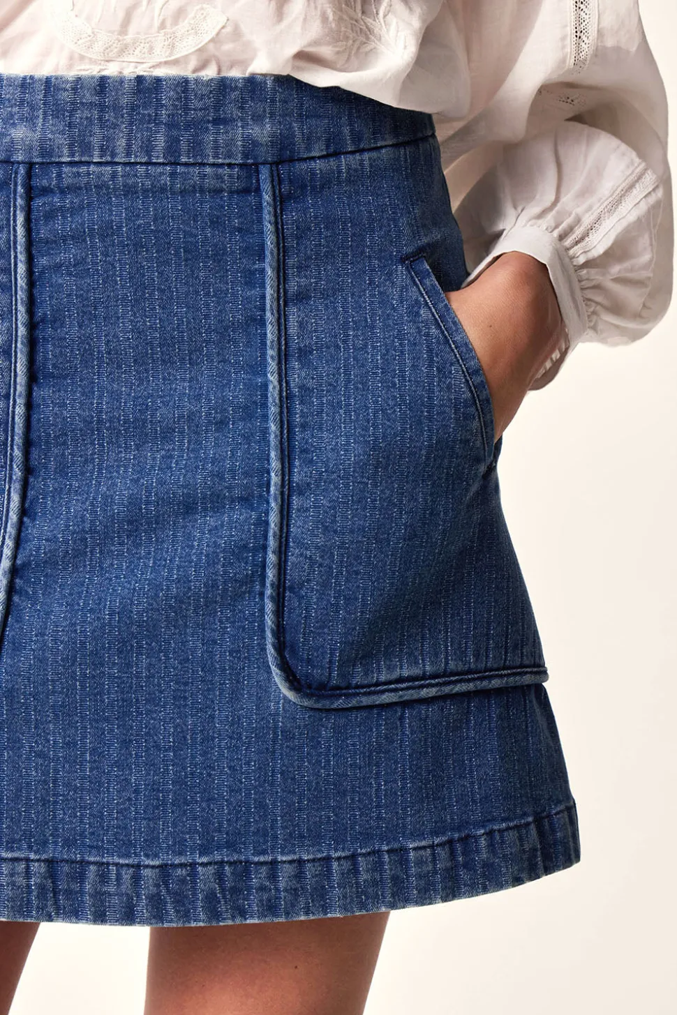 Plus que jamais au coeur des envies mode cette saison, la jupe courte en jean Louxor se porte coupe trapèze pour une silhouette rétro. En denim rayé et taille haute, elle s’accordera aussi bien à un chemisier ou pull fluffy. • Jupe courte en jean taille haute • Coupe trapèze • Poches passepoilées devant et dos • Ouverture par zip et bouton • Délavage écologique • Coloris Middle Blue : un bleu jean légèrement délavé à fines rayures • Modèle dessiné à Paris par notre styliste • Longueur : 38,5 cm pour une taille 1 • Malu mesure 1m75 et porte une taille 1| Conseil taille : Si vous hésitez entre deux tailles, choisissez la taille en dessous • La ligne de denim est travaillée en collaboration avec une spécialiste du denim éco-conçu