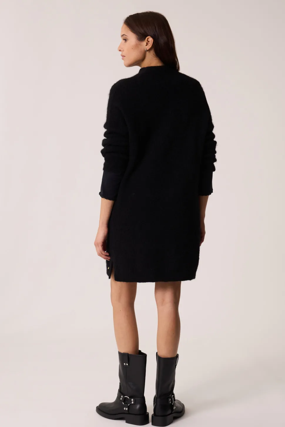 Valeur sûre à porter dès les premiers frimas, la robe pull Bemilie allie le look décontracté d’un pull à l’élégance d’une maille en alpaga superfine. Col montant et fendue en base, sa longueur et sa coupe droite vous permettront de la porter seule ou ceinturée. • Robe pull col montant • Coupe droite • Emmanchures décalées • Fentes en base • Finitions en bord-côte • Robe pull réalisée dans un nouveau fil italien du groupe « Mousseux » composé d’Alpaga Superfine du Pérou pour sa texture moelleuse et chaude et de polyamide recyclé ajoutant de l’élasticité • Coloris Noir : un noir intemporel • Modèle dessiné à Paris par notre styliste • Fabriqué en Italie • Longueur : 82 cm pour une taille 1 • Malu mesure 1m75 et porte une taille 1 • Conseil style : portez-la sous un manteau long avec les bottes Papricia