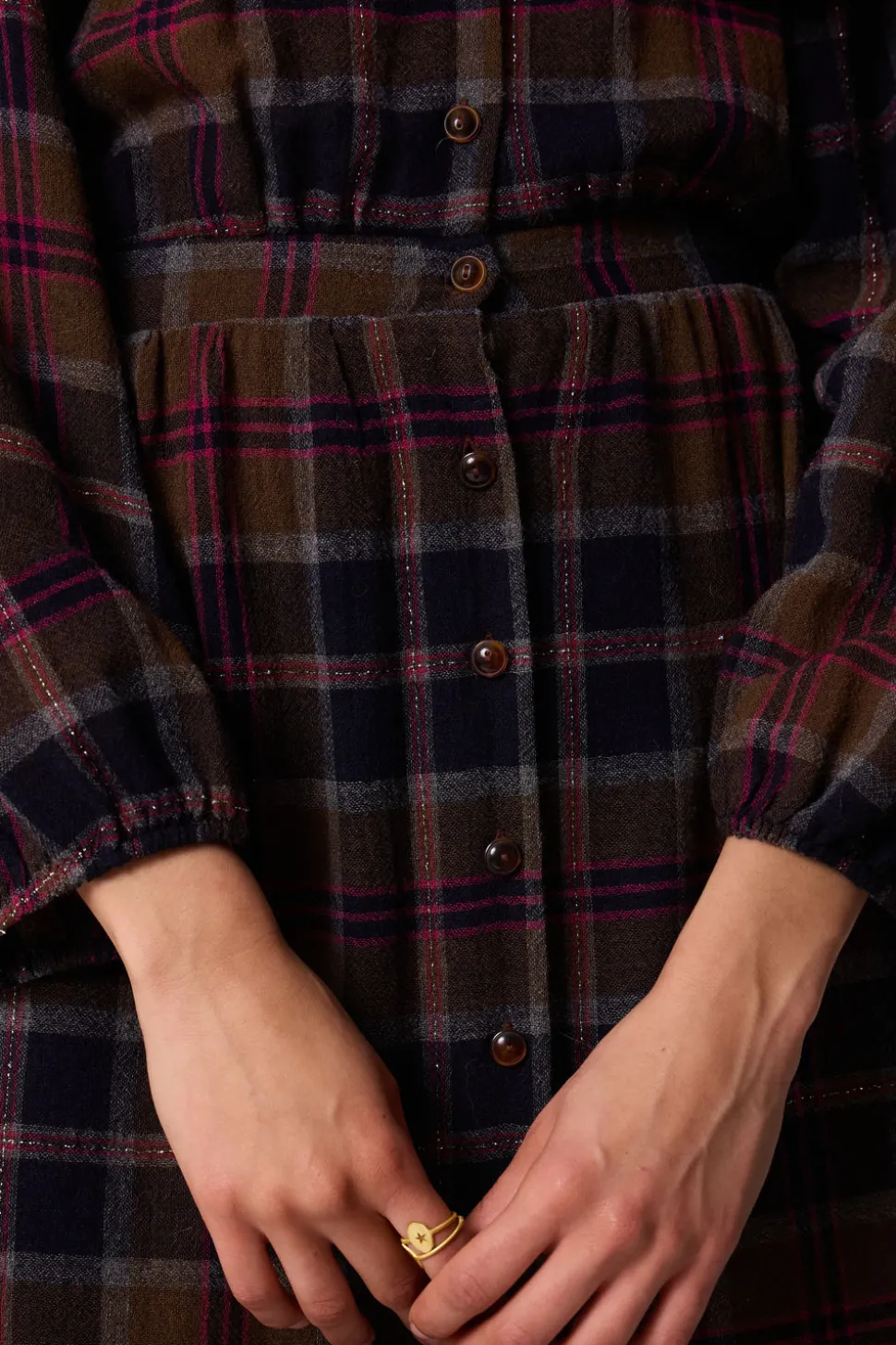 La robe longue Tomeo adopte un look rétro folk pour l’automne-hiver. Manches longues oversize, encolure V et cintrée à la taille pour structurer la silhouette, on craque pour son mélange de viscose et laine animé d’un motif tartan à détails de lurex. • Robe mi-longue • Encolure V • Manches longues oversize • Ouverture boutonnée • Taille élastiquée au dos • Jupe doublée • Imprimé exclusif Des Petits Hauts carreaux « Boma » : larges carreaux esprit tartan dans des tons vert kaki et bleu marine • Modèle dessiné à Paris par notre styliste • Longueur : 126 cm pour une taille 1 • Malu mesure 1m75 et porte une taille 1 • Conseil style : portez-la avec les bottes Papricia et le gilet sans manches Bunny pour un look folk