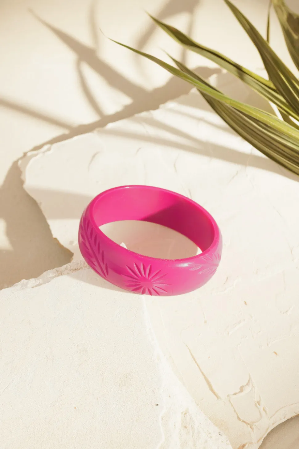 Ce bracelet jonc plaira à toutes les amatrices de bijoux vintage. En acétate brillant joliment gravé et décliné aux couleurs de la collection de vêtements, accordez-le à vos bracelets préférés pour sublimer votre poignet. • Jonc en acétate arrondi • Palme et soleil gravés • Finition brillante • Ce bracelet s’enfile et existe en taille unique • Ø 6,5 cm – Largeur : 1,5 cm • Livré avec un pochon de rangement