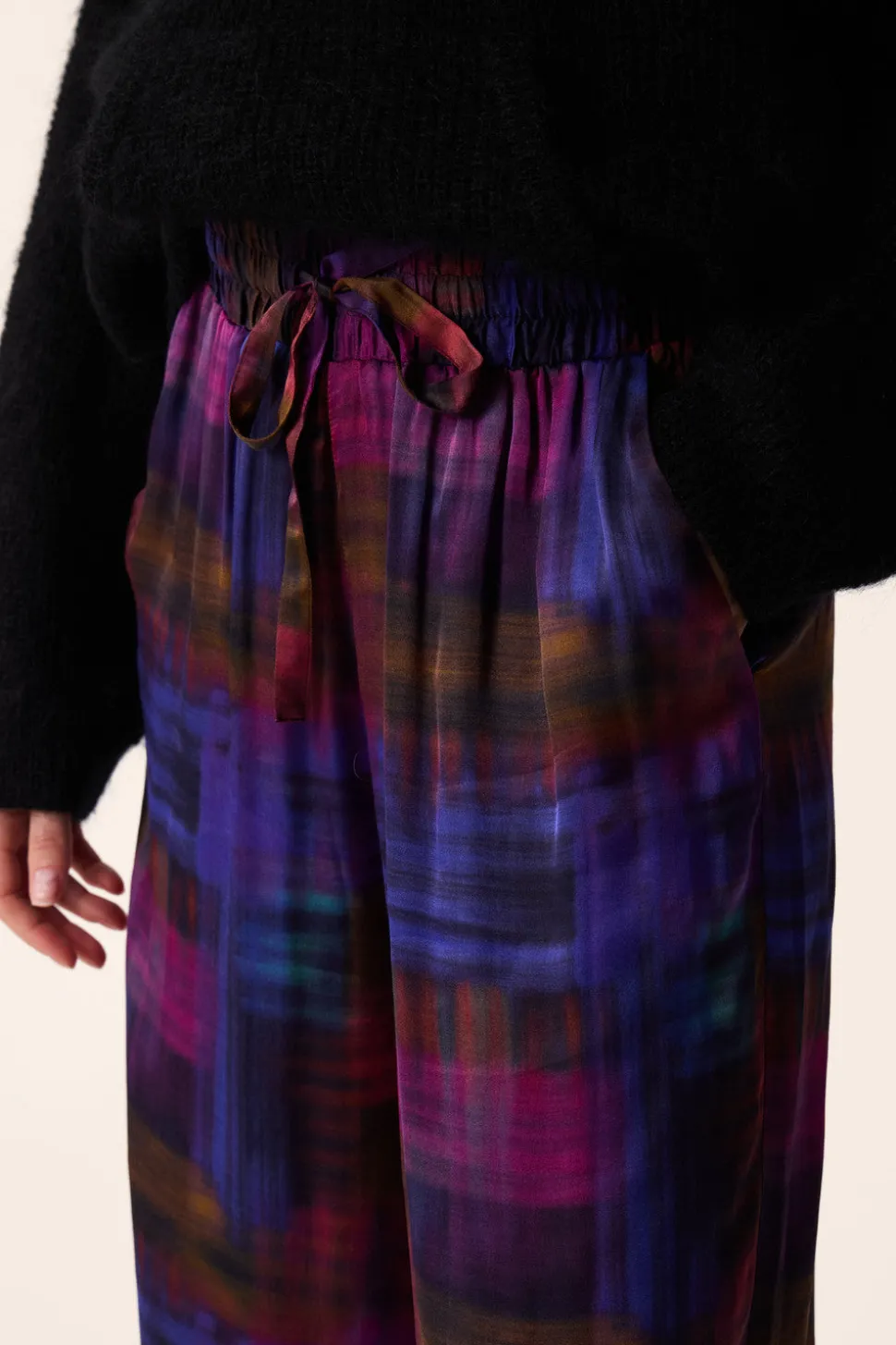 Pièce phare du vestiaire remportant tous les suffrages, les amatrices de vêtements de caractère ne passeront pas à côté du pantalon large Evanou en viscose. Avec sa coupe ample et fluide pour élancer la silhouette et son imprimé hypnotique, vous ne recevrez que des compliments. • Pantalon ample et fluide en viscose • Taille élastiquée froncée avec lien de serrage • Poches italiennes devant et fausses poches passepoilées au dos • Imprimé exclusif Des Petits Hauts « Anoki » présentant de grands carreaux diffus comme aquarellés aux tonalités automnales • Modèle dessiné à Paris par notre styliste • Longueur : 108 cm pour une taille 1 • Kryzia mesure 1m70 et porte une taille 36 • Conseil style : portez-le avec un body et des mocassins pour un look ultra féminin