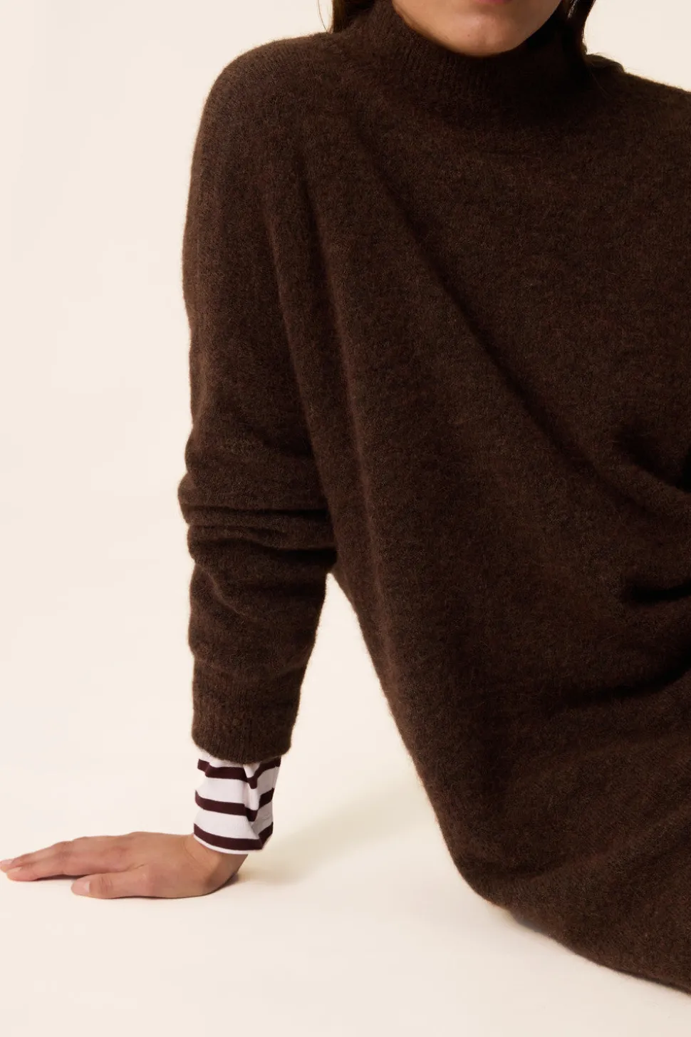 Valeur sûre à porter dès les premiers frimas, la robe pull Bemilie allie le look décontracté d’un pull à l’élégance d’une maille en alpaga superfine. Col montant et fendue en base, sa longueur et sa coupe droite vous permettront de la porter seule ou ceinturée. • Robe pull col montant • Coupe droite • Emmanchures décalées • Fentes en base • Finitions en bord-côte • Robe pull réalisée dans un nouveau fil italien du groupe « Mousseux » composé d’Alpaga Superfine du Pérou pour sa texture moelleuse et chaude et de polyamide recyclé ajoutant de l’élasticité • Coloris Ours : un marron foncé • Modèle dessiné à Paris par notre styliste • Fabriqué en Italie • Longueur : 82 cm pour une taille 1 • Malu mesure 1m75 et porte une taille 1 • Conseil style : portez-la sous un manteau long avec les bottes Papricia