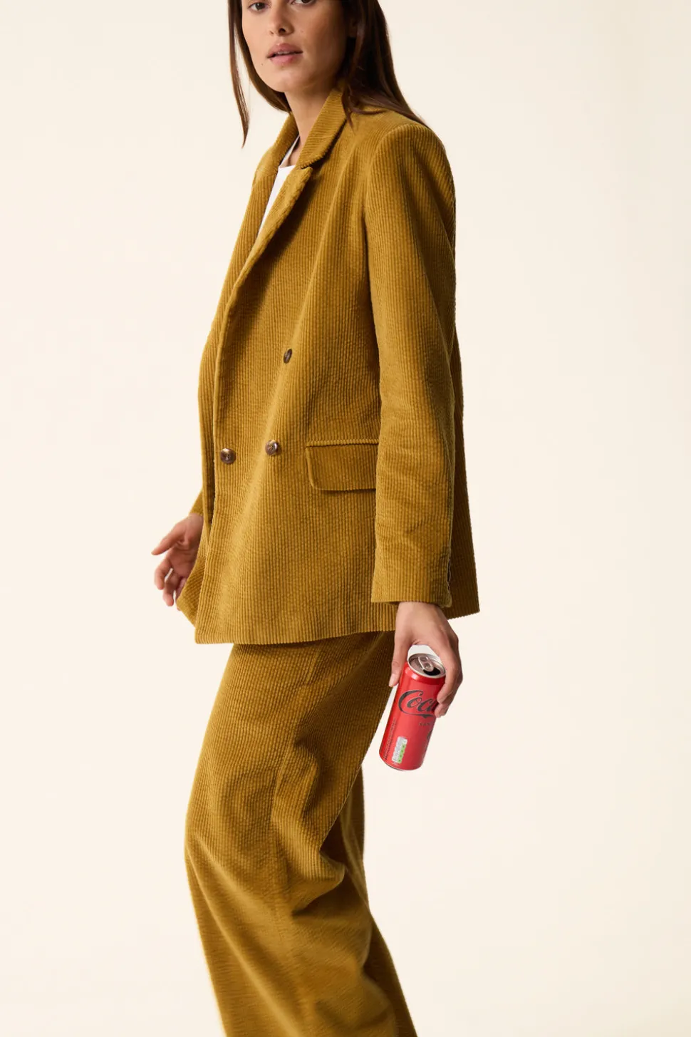 Icône du vestiaire portée de jour comme le soir, la veste de tailleur Sianette s’inspire du blazer croisé masculin pour l’automne. Revue et stylisée dans un velours côtélé très tendance cette saison, épaulettes, double boutonnage et poches à rabat façonnent cette pièce résolument mode. • Veste de tailleur en velours côtelé • Manches longues à épaulettes • Poignets boutonnés • Poches à rabat • Double boutonnage • Coloris Érable : un jaune ocre • Modèle dessiné à Paris par notre styliste • Longueur : 103 cm pour une taille 1 • Malu mesure 1m75 et porte une taille 36 • Conseil style : portez-le en total look avec le pantalon Sialito et les bottines Papilla pour une silhouette rétro